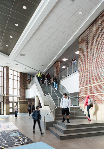While that exterior element stayed the same between the 2008 and 2012 timeframe, the district wanted to do something completely different with the interiors when the project was greenlit again in 2012. “The district staff decided to make the inside much more transparent, open, collaborative and connected,” Powell said. “The school building is divided into six smaller learning communities (SLCs) that each have more transparency to classrooms and more openness.”