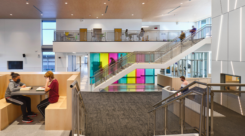 “Placing the addition in front of the existing building created an opportunity to modulate the first impression and create a new architectural expression without impacting the circulation of the site,” Lynn Petermann, senior project architect and senior associate at Perkins&Will, said in a statement emailed to School Construction News. “The addition emphasizes the library becoming the central hub, creating a seamless flow of space to the surrounding classrooms, labs, and performing arts space accessible from the library’s upper level.