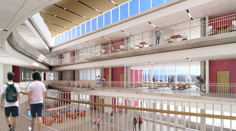 As designed, the new RSTC facility will feature a three-story atrium and include 18 science and tech labs, two teacher work spaces, six student work spaces, one TEAL (Technology Enhanced Active Learning) lab, one large research lab, four small research labs, a student café, and administrative offices.