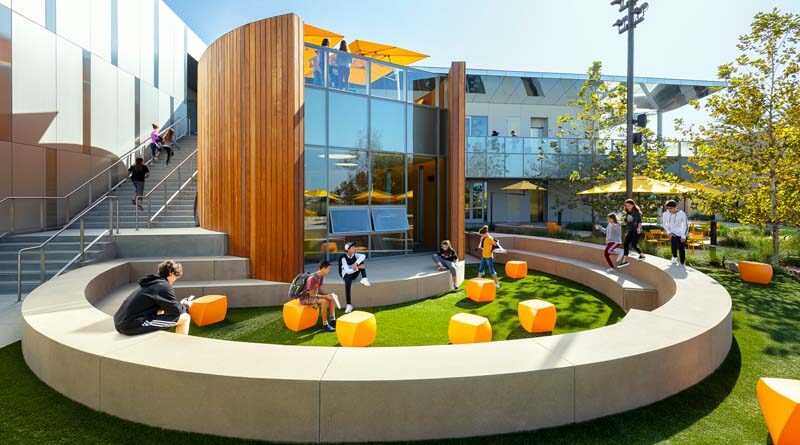 The school’s flexible learning environments allow for hands-on, project-based learning, indoors and out. Classrooms with glass walls open to the expansive views of the scenic Southern California community. A quad adjacent to the new buildings includes small group pods, an amphitheater and stage, evening performance lighting, a lunch terrace, an 18-foot-long concrete work bench table and a roof top huddle deck.