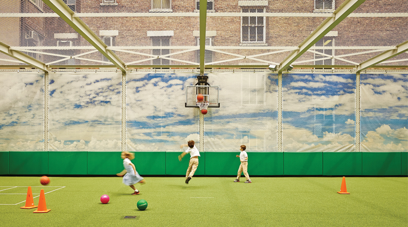 When activities other than ball play take place in the space, the school can open the space up for a greater variety of uses, and can be more of a true outdoor space. “In New York City, you are required to have protection for rooftop play spaces — including a lid to keep balls from falling out,” said Grant. “You commonly see cage-like spaces that can be nice but are still somewhat enclosed.”