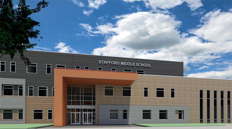 The middle school, which can accommodate 950 students in grades 6-8, is being constructed as part of Stafford MSD’s $62 million bond program that passed in November 2017. Designed by AutoArch Architects and constructed by Drymalla Construction, it will offer instructional spaces and programs designed to attract a diverse student population throughout the school district.