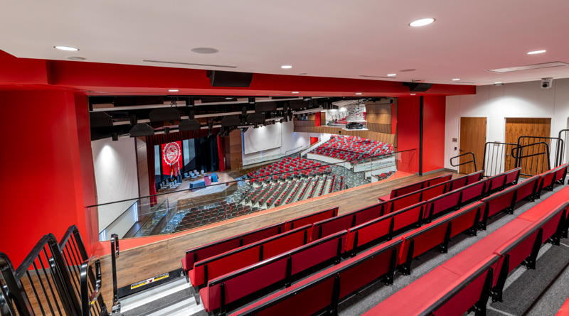 Inside, the welcome center will be home to offices for admissions, academic records, enrollment, financial aid, counseling and various other divisions. To host large gatherings, the building features a 1,300-seat auditorium that can be further divided for smaller events. An additional 800-seat ballroom with a rooftop patio will also be available year-round. A second-floor skybridge will allow people to have stellar views onto the welcome center’s courtyard as well as peer down at the first floor.