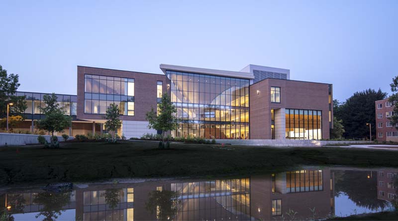The building is located within the heart of the university along the Red Cedar River. A central communal atrium is framed by two program “bars” that focus views through the building to the river and landscape beyond. Classrooms, student services and administrative spaces are dispersed through all levels and are arranged around this central social space.