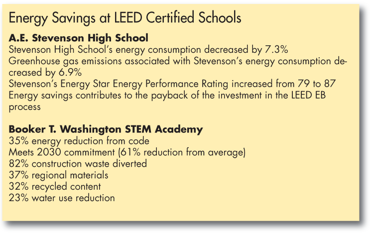 A: Typically, a LEED school is going to be 25 to 50 percent better in energy use than a co-compliant school. States have certain standards, and for Illinois, Booker T. Washington School is 35 percent better than that standard. That’s a comparison for when you build a new building, but for existing buildings the tool that they’re measured against right now is called a Consumer Builder Index. The Green Building Council has estimated that the average green building has a 35 percent reduction in carbon emissions. A LEED building shouldn’t have to cost you more money just to design it to meet LEED standards. However, there are some systems that will cost facilities more upfront — like a geothermal system, for example.