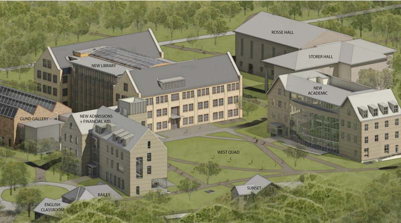 A new home for admissions and financial aid will bring together the offices, which currently operate in two separate buildings. Campus tours will depart from a new terrace anchoring the north end of the West Quad and will bring prospective students into the academic core. Multi-purpose spaces inside the building will allow greater flexibility in supporting and celebrating the campus community. All three buildings are pursuing LEED Certification with the library designed to achieve LEED Gold. Together, these individual projects strengthen the fabric of the entire campus and retain the distinctive identity that Kenyon has developed over its 195-year history.