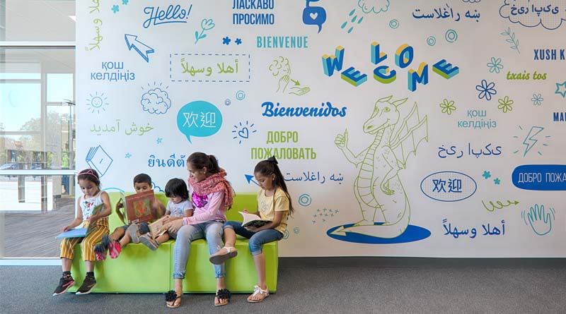 A welcome wall is situated near the front of the school with greetings in various languages. Additionally, the blue wing of the new facility represents Europe; the orange is Africa; the red wing is Asia; green represents North America; while fuchsia represents South America. Australia is represented by yellow and turquoise is Antarctica.