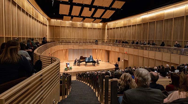 Highlights of the new venue include a 287-seat recital hall, a unique electro acoustic composition lab for digital music production, recording studio, digital fabrication lab blending art and music disciplines, additional rehearsal and practice rooms, faculty offices and studios, and the University Art Museum. The electro acoustic composition lab features octophonic sound, with eight speakers positioned around the room that can work in unison or function independently to support the creation and performance of music.