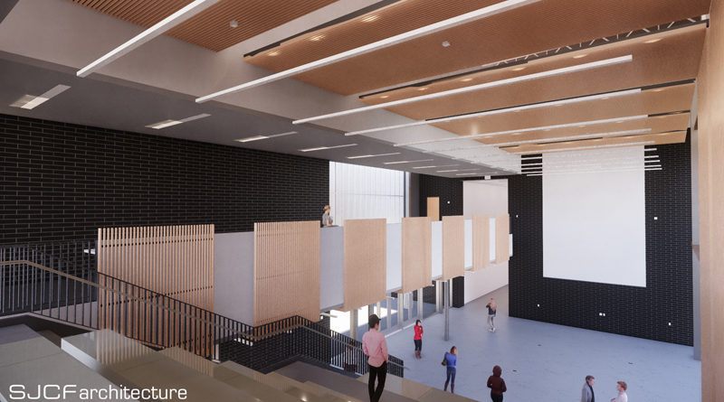 Classrooms will be organized by subject into two-story pods that radiate from a central area, which contains multi-use collaboration spaces along its length. The north end of the main corridor terminates in an open lecture hall space called the “Learning Stair,” and area with tiered seating.This space can be utilized for staff meetings, student groups and guest lectures, as well as a large teaching space.