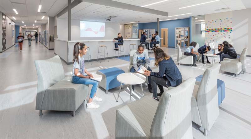 The layout of the school positions four grade-defined neighborhoods around a central courtyard. Each neighborhood features a “front porch” and active learning hub that responds to its students’ ages, while also encouraging staff collaboration. The spaces within the school accommodate different sizes: coaching rooms (2 to 3 students); small group learning areas (8 to 12 students); typical classrooms (20 to 28 students); active learning and flexible learning areas (40 to 50 students); and large assembly areas (50-plus students).