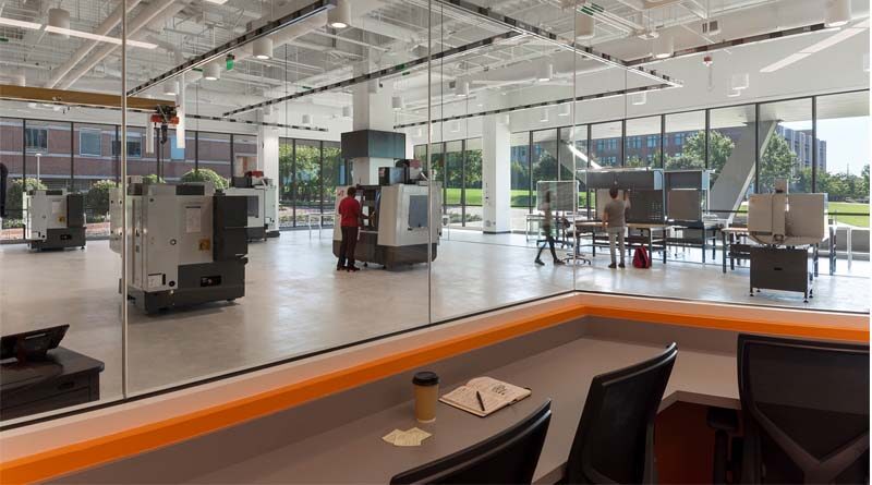Fitts-Wollard Hall represents the latest iteration in the college’s Think and Do campaign, meant to marry prominent ideas with practical execution. Accordingly, the new building is meant to showcase “engineering on display” via extensive glass windows allowing more sunlight to penetrate the interior of the four-story building. Entry lobbies at the south and north ends of the building are connected to one another via open corridors that allow passersby to peer directly into the engineering labs.