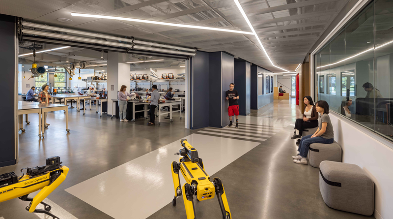 Over its trio of levels, the Swenson Family Hall of Engineering entails laboratories for both teaching and research, a robotics lab, collaborative spaces, dean’s suite as well as dedicated faculty space. The building also features meeting areas and dedicated workspaces.