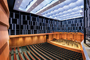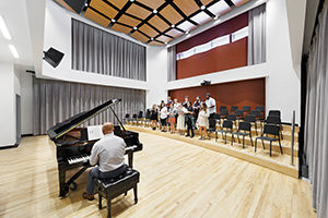 “The concert hall itself was conceived as a music instrument, applying the same principle of the resonance chamber found in many string instruments to achieve a three-second reverberation time for choir performances,” Brown said. “Sound absorptive panels, mechanized perimeter drapery and a moveable stage cloud can all be configured to cater to the large variety of music genres offered by the school program.”
