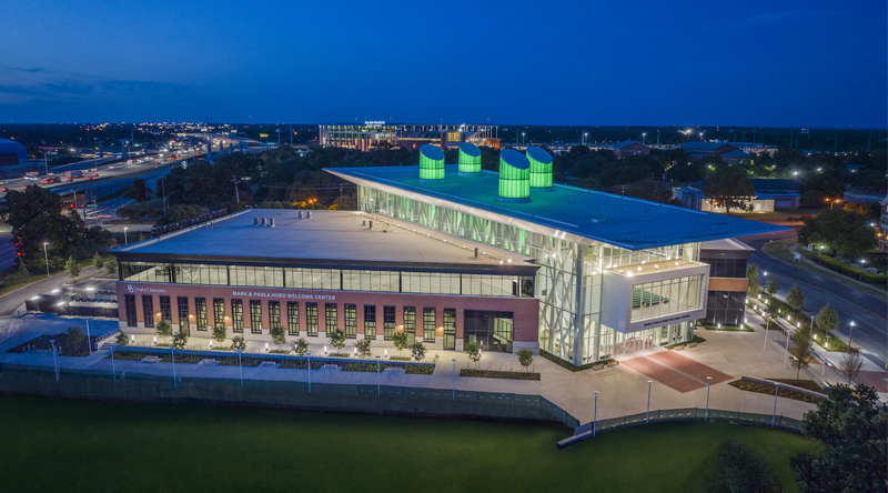 WACO, Tex.—Baylor University has a new “front door” at its campus thanks to a project envisioned by designer Populous. The 136,000-square-foot Mark and Paula Hurd Welcome Center—named for alumnus and Oracle founder Mark Hurd and his wife, Paula—is also home to Baylor’s undergraduate admissions office and alumni center, as well as a coffee house, auditorium and ballroom space.