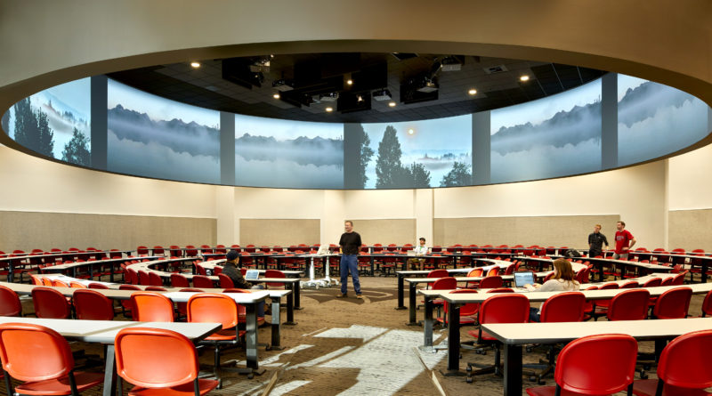 One of the most notable features of the building is the classroom-in-the-round — a 275-seat classroom that accommodates 360 degrees of projected content. The classroom includes modular, moveable furniture that allows for classroom-wide discussions as well as smaller group activities.